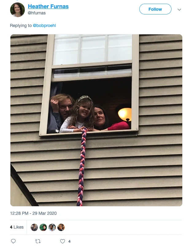 “I am so grateful we found a way to make it possible to see her friends throughout the day. Everyone just signed up for their own 15-minute time slot and there was an automatic buffer before the next sign-up time [to keep visitors a safe distance apart]. It worked so well! Her friends made signs, they sang her songs. And they yelled, ‘Rapunzel, Rapunzel, let down your hair!’”